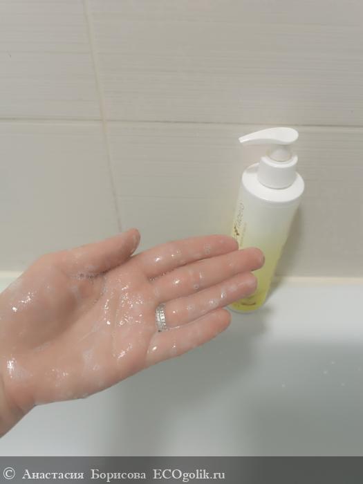 Средство обладает нежной, мягкой текстурой, напоминающей легкий гель для душа. Оно однородное, слегка вязкое и приятно ложится на кожу, обеспечивая мягкое и комфортное очищение. Абсолютно прозрачное, как стеклышко, средство визуально ассоциируется с чистотой и свежестью. Едва различимый аромат, дарит приятное ощущение свежести, не напрягая обоняние.