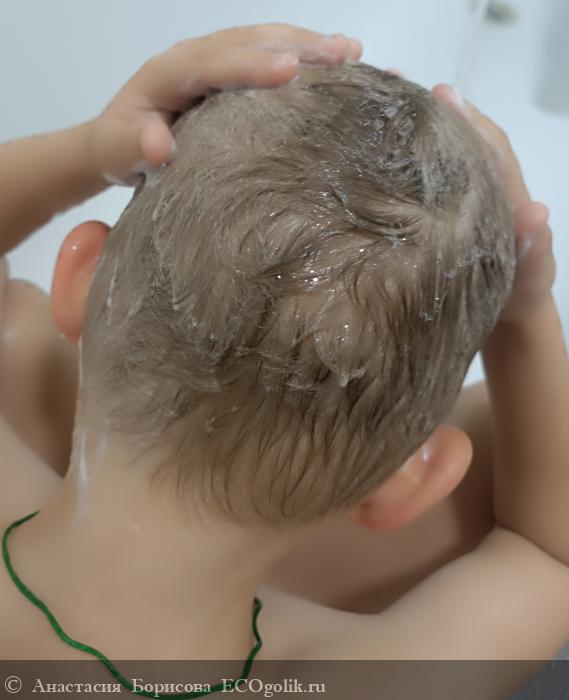 Своему малышу я наношу совсем небольшое количество шампуня на влажные волосы, аккуратно распределяя его массажными движениями. Затем тщательно смываю теплой водой, внимательно следя, чтобы шампунь случайно не попал в глазки сына.