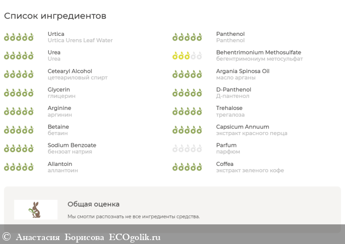 Urtica Urens Leaf Water, Behentrimonium Methosulfate, Cetearyl Alcohol, Urtica Urens Seed Extract, Burdock (Arctium Lappa) Root Oil, Argania Spinosa Kernel Oil, Glycerin, Panthenol, Urea, Arginine, Trehalose, Betain, Capsicum Annuum Extract, Sodium Benzoate, Parfum, Allantoin, Coffea Robusta Seed Extract. Гидролат крапивы, бегентримониум метосульфат, цетеариловый спирт, масляный экстракт крапивы, масло корня лопуха, масло арганы, глицерин, Д-пантенол, гидрованс, аргинин, трегалоза, бетаин, экстракт красного перца, бензоат натрия, парфюм, аллантоин, экстракт зеленого кофе