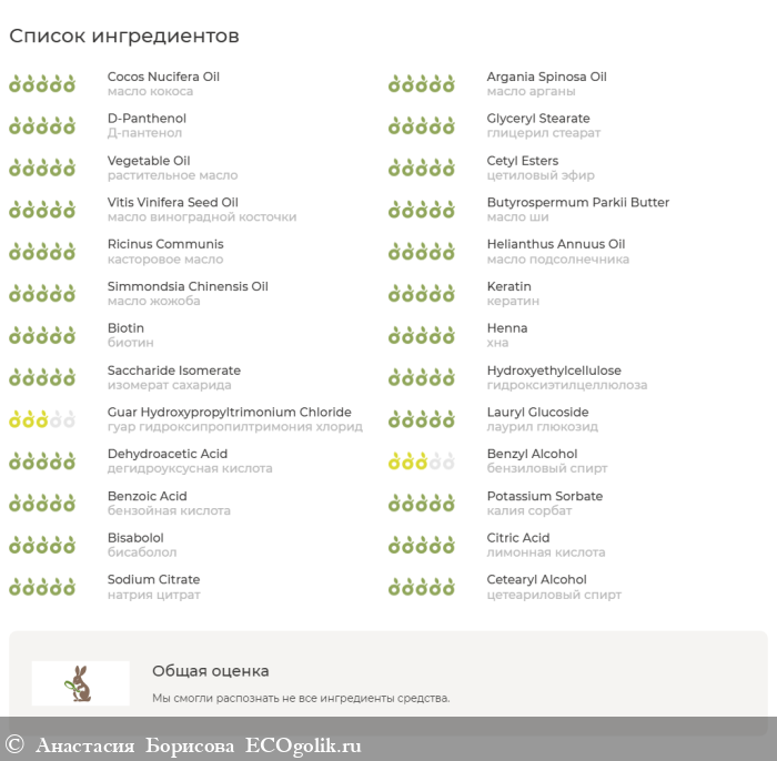 Специально подготовленная вода, масло кокоса, масло оливы европейской, масло арганы, Д-пантенол, глицерил стеарат, растительное масло, цетиловый эфир, масло виноградной косточки, масло ши, касторовое масло, масло подсолнечника, масло жожоба, кератин, биотин, хна, экстракт лемонграсса, изомерат сахарида, гидроксиэтилцеллюлоза, гуар гидроксипропилтримония хлорид, лаурил глюкозид, дегидроуксусная кислота, бензиловый спирт, бензойная кислота, калия сорбат, бисаболол, лимонная кислота, натрия цитрат, цетеариловый спирт, пищевая отдушка с гипоаллергенным статусом