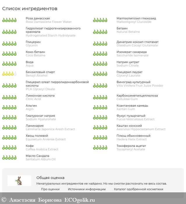 Aqua,Rosa Damascena Flower Water,Maltooligosyl Glucoside (and) Hydrogenated Starch Hydrolysate,Natural Betaine,Glycerin,Disodium Cocoyl Glutamate*,Coco Betaine*,Saccharide Isomerate (and) Aqua (and) Citric Acid (and) Sodium Citrate*,Benzyl Alcohol (and) Glyceryl Laurate*,PCA Glyceryl Oleate*,Vitis Vinifera (Grape) Fruit Juice Powder (сок винограда),Citric Acid,Cellulose Gum (and) Algin*,Xantan Gum,Sodium Hyaluronate,Fucus Vesiculosus (фукуса) Extract,Laminaria Japonica Aresh (ламинарии) Extract,Aesculus Hippocastanum (конского каштана) Extract,Equisetum Arvense (хвоща) Extract,Hedera Helix (плюща) Extract,Coffea Arabica (кофе) Extract,Tocopheryl Acetate (Витамин Е),Rosa Affinis Rubiginosa Oil (эфирное масло розы),Santalum Album Oil (эфирное масло сандала)