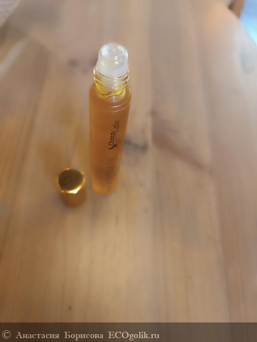 Сам флакон изготовлен из прозрачного жёлтого стекла объемом 14 мл, сквозь которое просматривается содержимое. Верхушка оснащена удобным роликовым аппликатором-прозрачным шариком, обеспечивающим точное и удобное нанесение средства. Завершающим штрихом служит золотистая крышечка, придающая изделию элегантность и завершённость образа. Название бренда ChocoLatte и вся необходимая информация выполнены красивым чёрным шрифтом.
