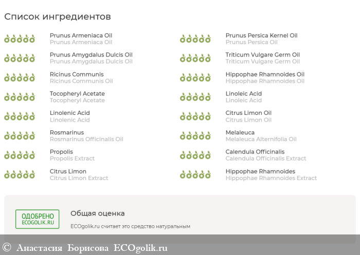 Prunus Armeniaca (абрикосовое) Oil, Prunus Persica (персиковое) Oil, Prunus Amygdalus Dulcis (миндальное) Oil, Triticum Vulgare Germ (зародышей пшеницы) Oil, Ricinus Communis (касторовое) Oil, Hippophae Rhamnoides (облепихи) Oil, Tocopheryl Acetate (витамин Е), Linoleic Acid (and) Linolenic Acid (витамин F), Citrus Limon Oil (эфирное масло лимона), Rosmarinus Officinalis Oil (эфирное масло розмарина), Melaleuca Alternifolia Oil (эфирное масло чайного дерева), Propolis (прополиса) Extract, Calendula Officinalis (календулы) Extract, Citrus Limon (лимона) Extract, Hippophae Rhamnoides (облепихи) Extract