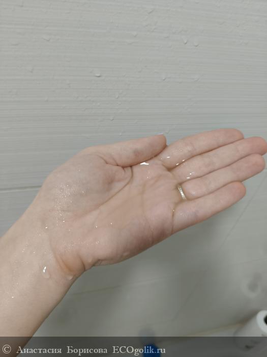 Текстура шампуня представляет собой нежную гелевую консистенцию, обладающую приятной легкостью и легкостью нанесения. Полупрозрачная структура создает впечатление чистоты и прозрачности, визуально усиливая восприятие натуральности и высокого качества продукта. Гель быстро распределяется по волосам, обеспечивая эффективное и бережное очищение, оставляя ощущения свежести и комфорта. Такая текстура отлично сочетается с ощущением легкой прохлады и чистого аромата, способствующих полному расслаблению и наслаждению процедурой мытья волос.