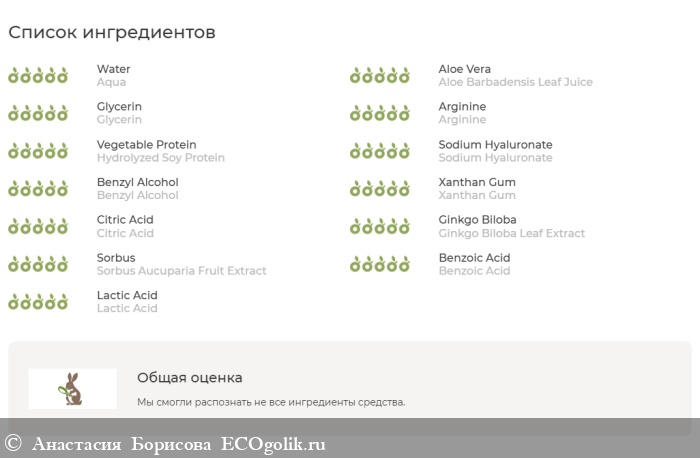 Aqua, Aloe Barbadensis Leaf Juice*, Glycerin, Arginine, Pentylen Glycol, Hydrolyzed Soy Protein, Sodium Hyaluronate, Benzyl Alcohol, Xanthan Gum, Citric Аcid, Polygonum Fagopyrum Seed Extract, Ginkgo Biloba Leaf Extract, Sorbus Aucuparia Fruit Extract, Benzoic Acid, Lactic Acid.