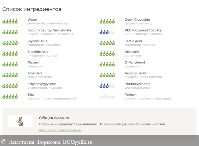 Деионизированная вода, децил глюкозид, лауроил саркозинат натрия, ПЭГ-7 глицерил кокоат, гликолевая кислота, молочная кислота, янтарная кислота, аллантоин, глицерин, д-пантенол, гель алоэ вера, аскорбиновая кислота, этилгексилглицерин, феноксиэтанол, экстракт пятилистника кустарникового, экстракт бокконии, экстракт липы сердцевидной, экстракт льняного семени, экстракт лабазника, экстракт орегано, ароматическая композиция.