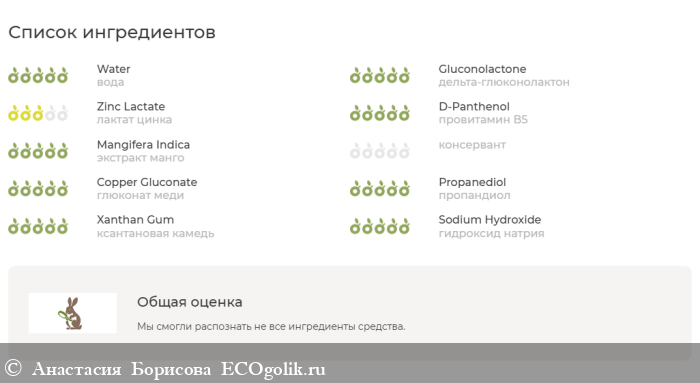 вода* (Aqua); дельта-глюконолактон* (Delta-Gluconolactone); МСМ (DimethylSulfone); лизатпропионовокислых бактерий* (PropionbacteriumFermentLysate); лактат цинка* (ZincLactate); провитамин В5 (Panthenol); экстракт манго* (MangiferaIndicaFruitExtract); консервант* (SorbitanCaprylate, Propanediol, BenzoicAcid); глюконат меди* (CopperGluconate); пропандиол* (Propanediol); ксантановая камедь* (XanthanGum); гидроксид натрия* (SodiumHydroxide); зеленыйхелатор* (Tetrasodium Glutamate Diacetate).
