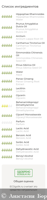 Состав: Hippophae Rhamnoides Water (Настой Облепихи), Prunus Amygdalus Dulcis Oil (Масло Миндаля), Arctium Lappa Root (Burdock) Oil (Репейное Масло), Carthamus Tinctorius Seed Oil (Сафлоровое Масло), Simmondsia Chinensis Seed Oil (Масло Жожоба), Pinus Sibirica Seed Oil (Масло Кедрового Ореха), Aqua, Panax Ginseng Root Extract (Экстракт Женьшеня), Lecithin (Лецитин), Glycerin, Behenamidopropyl Dimethylamine, Glyceryl Monostearate, Parfum, Lactic Acid, Benzoic Acid, Sorbic Acid, Dehydroacetic Acid, Benzyl Alcohol