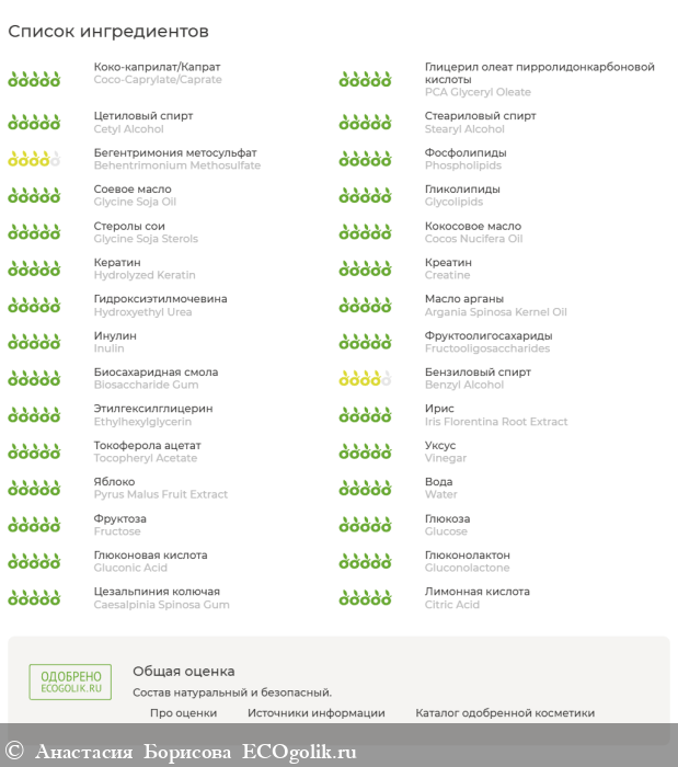 Aqua,Coco-Caprylate/Caprate*,PCA Glyceryl Oleate*,Cetyl Alcohol (and) Stearyl Alcohol,Behentrimonium Methosulfate,Phospholipids (and) Glycine Soja (soybean) Oil (and) Glycolipids (and) Glycine Soja (soybean) Sterols,Cocos Nucifera (Coconut) (кокоса) Oil,Hydrolyzed Keratin (and) Creatine,Hydroxyethyl Urea (and) Aqua,Argania Spinosa Kernel Oil,Inulin,Fructooligosaccharides,Biosaccharide Gum,Benzyl Alcohol (and) Ethylhexylglycerin,Iris Florentina Root (ириса) Extract,Tocopheryl Acetate (Витамин Е),Vinegar (and) Pyrus Malus (Apple) Fruit Extract (and) Water (and) Fructose (and) Glucose (and) Gluconic Acid (and) Gluconolactone (and) Caesalpinia Spinosa Gum,Citric Acid (лимонная кислота)