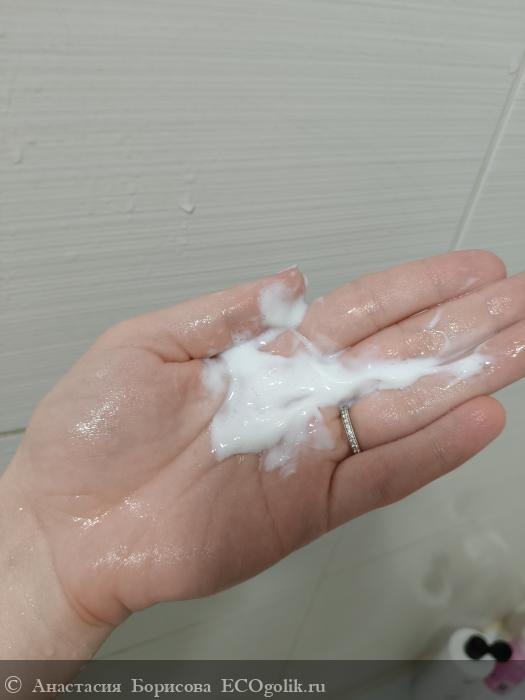 Кондиционер обладает густой, кремовой текстурой белого цвета, которая легко распределяется по волосам. Продукт имеет приятный, нежный аромат, который освежает и создает ощущение чистоты и комфорта во время использования.