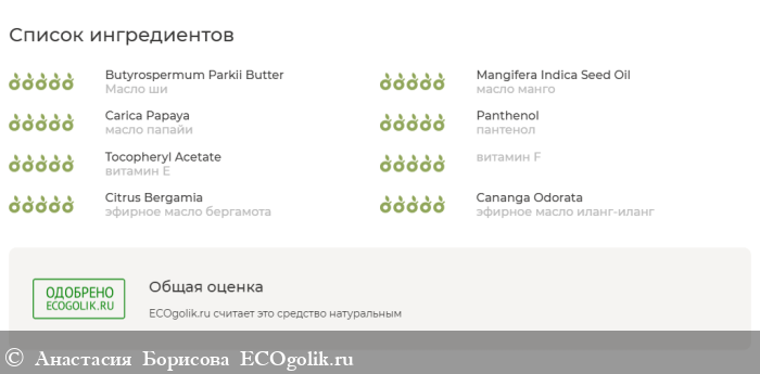 Масло ши, масло манго, масло папайи, пантенол, витамин Е, витамин F, эфирное масло бергамота, эфирное масло иланг-иланг