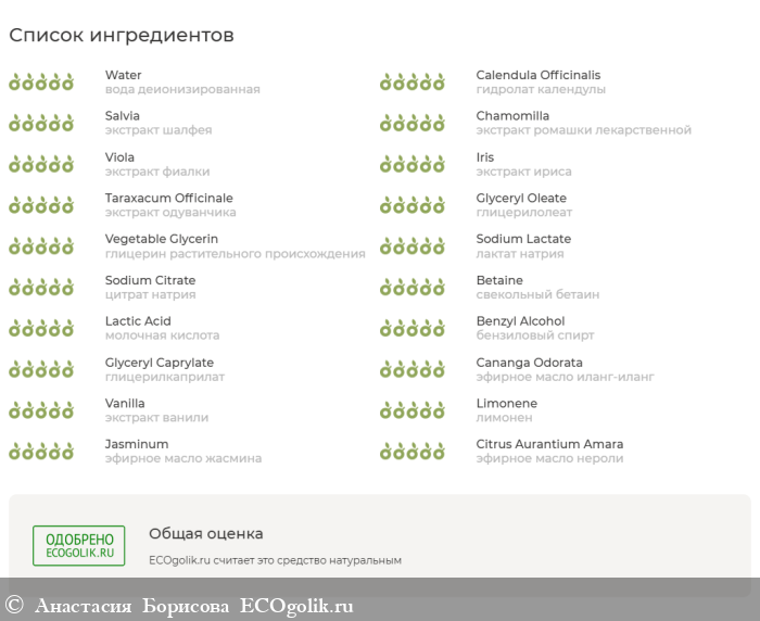 вода деионизированная, гидролат календулы, экстракт шалфея, экстракт ромашки лекарственной, экстракт фиалки, экстракт ириса, экстракт одуванчика, глицерилолеат, глицерин растительного происхождения, лактат натрия, цитрат натрия, свекольный бетаин, молочная кислота, бензиловый спирт, глицерилкаприлат, эфирное масло иланг-иланг, экстракт ванили, лимонен, эфирное масло жасмина, эфирное масло нероли.