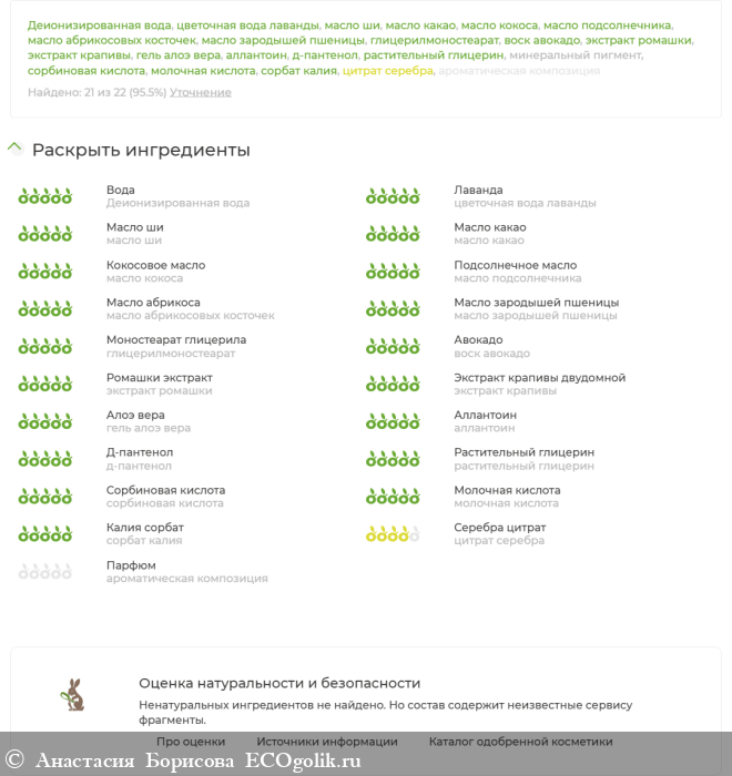Деионизированная вода, цветочная вода лаванды, масло ши, масло какао, масло кокоса, масло подсолнечника, масло абрикосовых косточек, масло зародышей пшеницы, глицерилмоностеарат, воск авокадо, экстракт ромашки, экстракт крапивы, гель алоэ вера, аллантоин, д-пантенол (провитамин В5), растительный глицерин, минеральный пигмент, сорбиновая кислота, молочная кислота, сорбат калия, цитрат серебра, ароматическая композиция.
