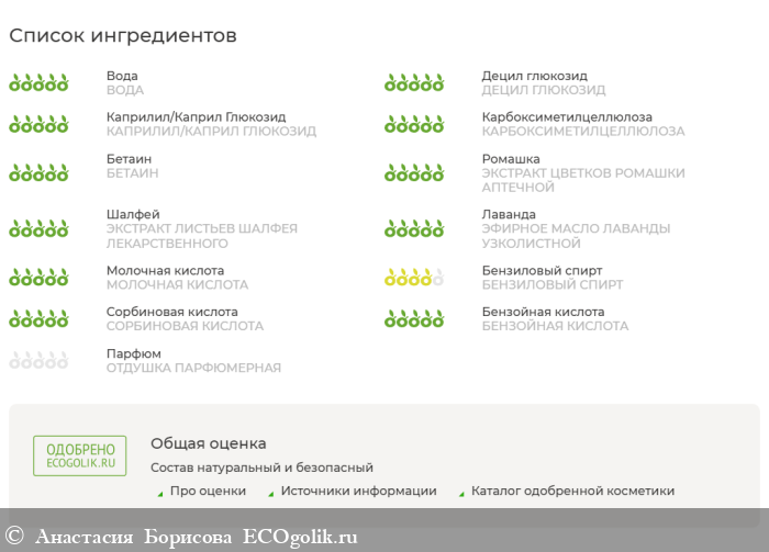 ВОДА, ДЕЦИЛ ГЛЮКОЗИД, КАПРИЛИЛ/КАПРИЛ ГЛЮКОЗИД, КАРБОКСИМЕТИЛЦЕЛЛЮЛОЗА, БЕТАИН, ЭКСТРАКТ ЦВЕТКОВ РОМАШКИ АПТЕЧНОЙ, ЭКСТРАКТ ЛИСТЬЕВ ШАЛФЕЯ ЛЕКАРСТВЕННОГО, ЭФИРНОЕ МАСЛО ЛАВАНДЫ УЗКОЛИСТНОЙ, МОЛОЧНАЯ КИСЛОТА, БЕНЗИЛОВЫЙ СПИРТ, СОРБИНОВАЯ КИСЛОТА, БЕНЗОЙНАЯ КИСЛОТА, ОТДУШКА ПАРФЮМЕРНАЯ.