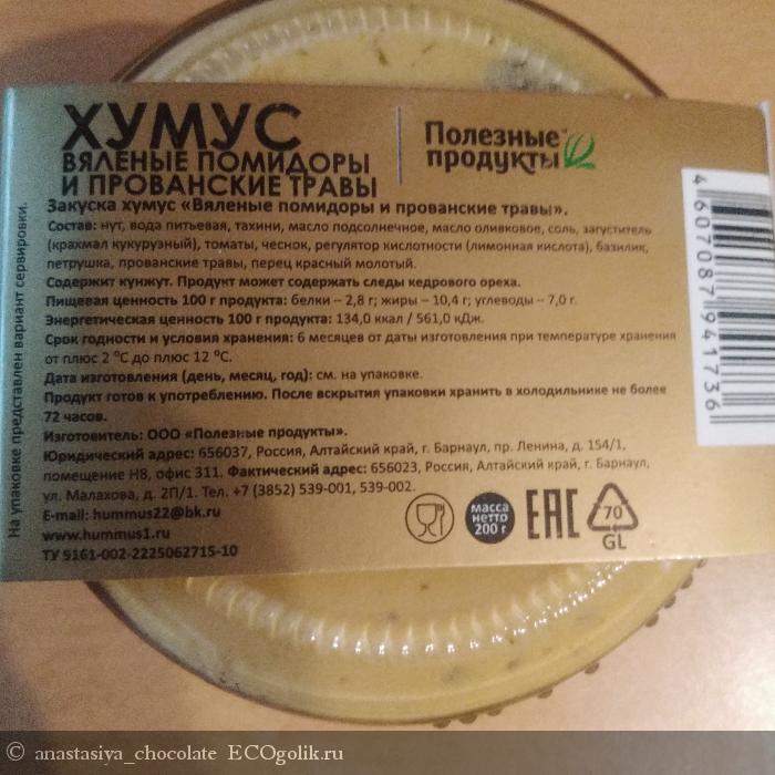 Состав: нут, вода питьевая, тахини, масло подсолнечное, масло оливковое, соль, загуститель (крахмал кукурузный), томаты, чеснок, регулятор кислотности (лимонная кислота), базилик, петрушка, прованские травы, перец красный молотый.