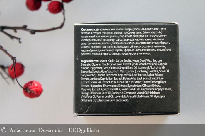 Состав: вода артезианская, каолин, сферы угольные, цеолит, воск нима, сахарозы стеарат, глицерин, экстракт теоброма какао (и) токоферол (и) каприловый / каприк триглицерид, масло виноградных косточек, спирт изостериловый (и) босвеллии серрата камедь, масло клюквы, масло ши, спирт цетиловый, ланолин, экстракты эхинацеи, шалфея, жимолости, березы, клюквы, зеленого чая, малины, женьшеня, облепихи, окопника, магнолии, масла абрикоса, ним, таману, бораго, эфирные масла можжевельника, найоли, фенхеля, лаванды, иссопа, склероглюкан, кислота молочная.