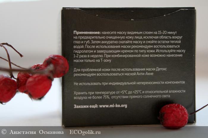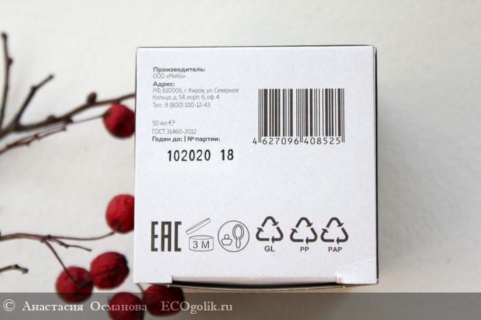 Оформление маски стильное, выдержанное в черных тонах. На баночке есть защита от вскрытия в виде фирменной наклейки бренда. Сама баночка стеклянная, немного отличающаяся от стандартного исполнения и формы темных баночек МиКо.