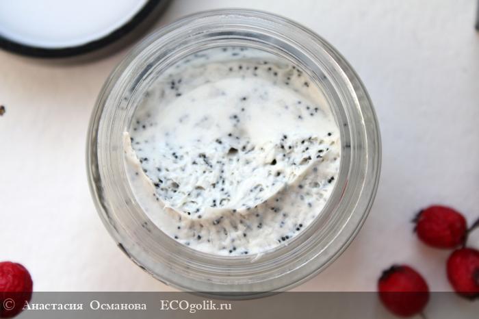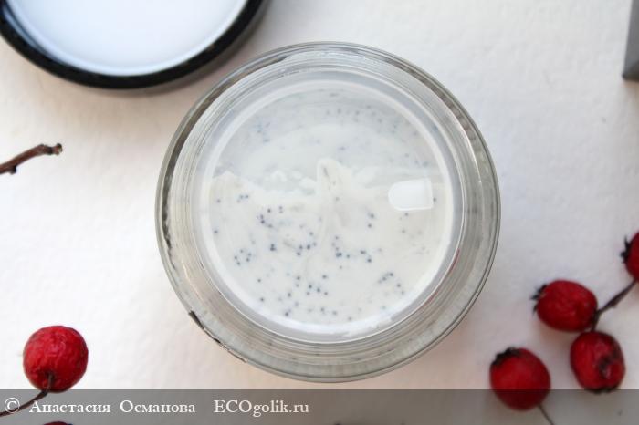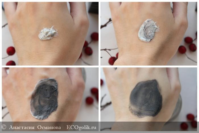 Упаковка имеет пластиковый ограничитель, который не дает маске контактировать с крышкой. Консистенция весьма необычного формата - белая кремовая текстура с черными угольными гранулами.