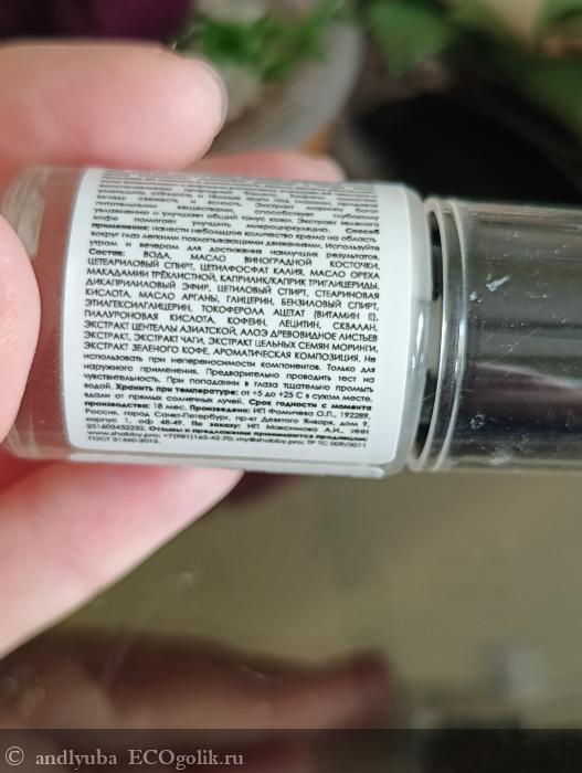 В этот раз состав меня порадовал на 100%, т.к. глицерин это не то что я хочу видеть в составе крема для век на 2 месте. Тут он где-то в середине и это несомненно плюс.