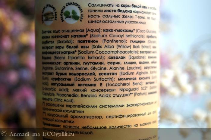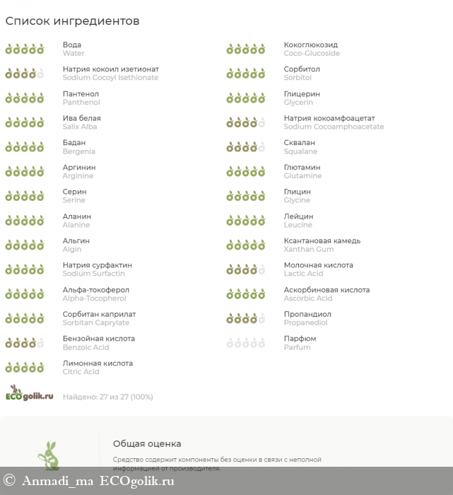 Мне понравился состав, помимо привычных мягких ПАВ я нашла тут молочную кислоту, аминокислоты, пребиотики и увлажняющие компоненты. Агрессивных очищающих компонентов в составе нет. Сервис проверки составов Экоголик тоже счёл это средство натуральным, и единственным подозрительным компонентом оказалась отдушка, так как производителем она не раскрыта.