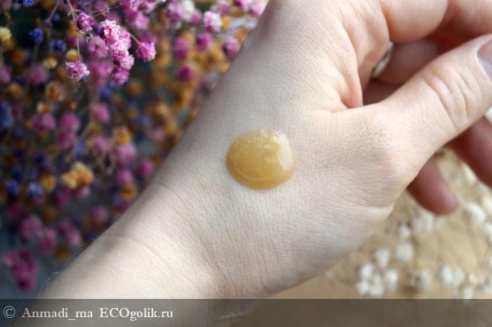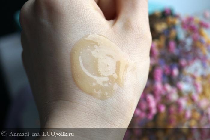 Консистенция приятная, лёгкая. Гель не густой и не плотный. Он замечательно распределяется по коже, буквально сам скользит по ней, ничего растирать не требуется. Поэтому на разовое использование нужно пару капель, обычно на одно умывание я беру геля размером с маленькую фасолину, даже куда меньше чем использовала на фото.