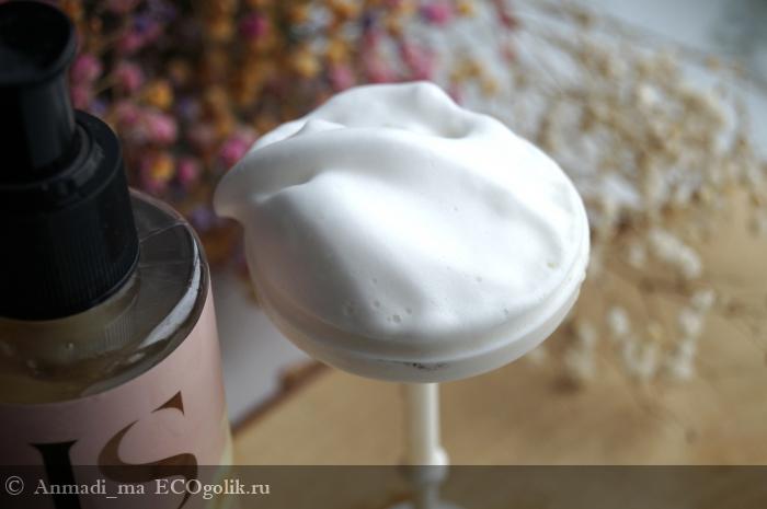 Гель деликатный и нежный, он не пощипывает, не покалывает кожу. Я выдавливаю средство на ладони, аккуратно распределяю и массажными движениями наношу на лицо, в том числе на область губ, век и ресниц. Ещё один весомый плюс - гель не щиплет глаза, даже если случайно открыть их во время намыливания.