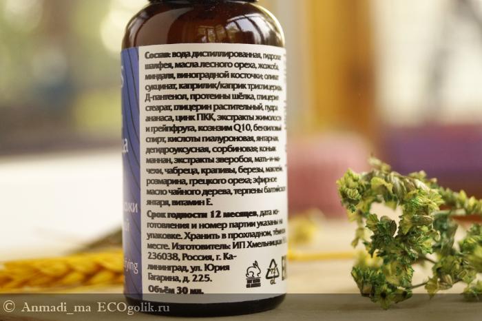 вода дистиллированная, гидролат шалфея, масла лесного ореха, жожоба, миндаля, виноградной косточки; оливат сукцинат, каприлик/каприк триглицериды, Д-пантенол, протеины шёлка, глицерил стеарат, глицерин растительный, пудра ананаса, цинк ПКК, экстракты жимолости и грейпфрута, коэнзим Q10, бензиловый спирт, кислоты гиалуроновая, янтарная, дегидроуксусная, сорбиновая; коньяк маннан, экстракты зверобоя, мать-и-мачехи, чабреца, крапивы, березы, маклейи, розмарина, грецкого ореха; эфирное масло чайного дерева, терпены балтийского янтаря, витамин Е