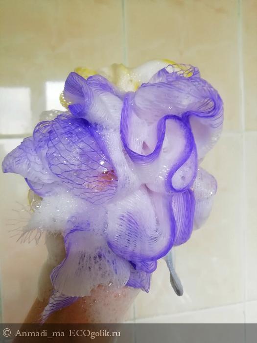 А тут наносила на мочалку для тела. 2 порции хватает чтобы получить вот такое пышное облачко. Мне нравится мыть такой пенкой детей - она получается очень нежной и мягкой.