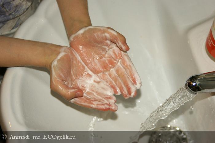 И мне она очень нравится. Средство очень легко распределяется по коже, буквально скользит. Благодаря этому у мыла экономичный расход, потому что мне хватает буквально одного нажатия на дозатор, чтобы промыть руки, и буквально 2-3 чтобы помыть всё тело.
