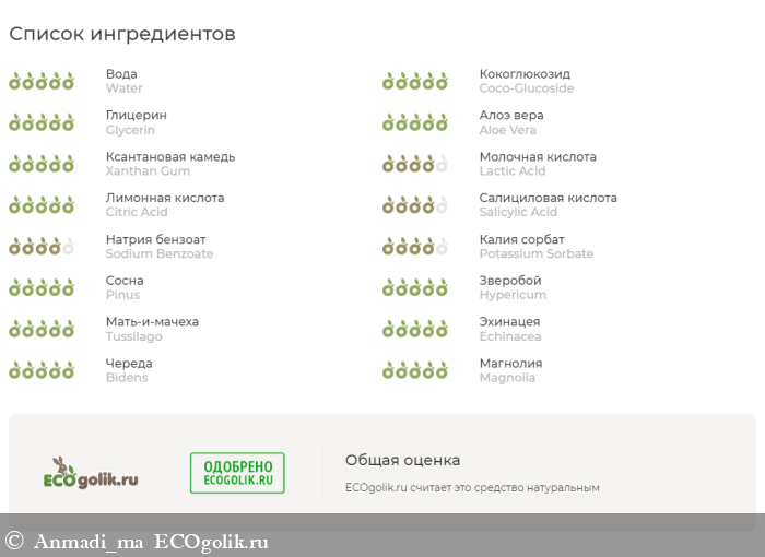 Комплекс кислот для деликатного пилинга кожи - салициловая, лимонная. И экстракты трав и растений. Состав понравился не только мне, но и Экоголику, который отметил его как полностью натуральный.