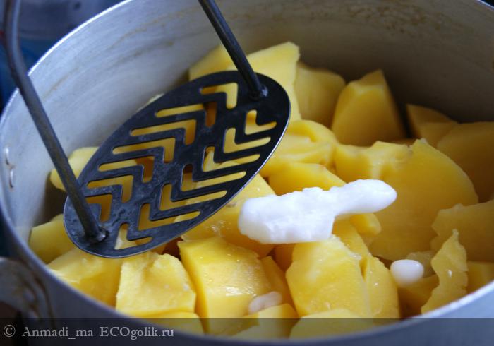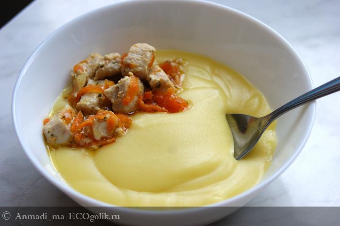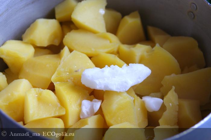 К тушёной курочке я приготовила картофель пюре, на молоке и с кокосовым маслом. Получилось такое воздушное облачко, и очень вкусное. Масло я добавляла уже на последнем этапе, когда слила воду, но до того как добавила прохладное молоко.