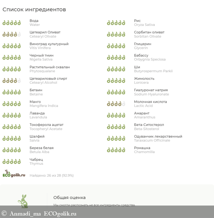 По традиции - небольшая проверка через сервисы Экоголика, ведь не зря говорится: "доверяй, но проверяй". Экоголик не нашёл всего 2 компонента из 28 - огурец и экстракт гранатовых косточек. Так как и тот и другой компоненты натуральные, то смело заявляю что состав одобрен.