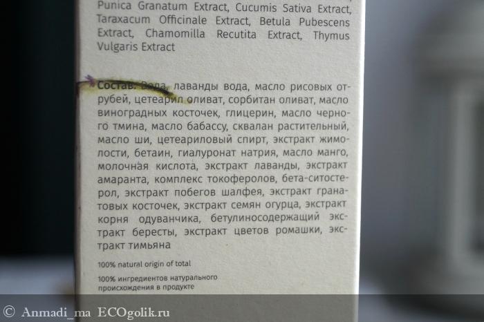Вода, лаванды вода, масло рисовых отрубей, цетеарил оливат, сорбитан оливат, масло виноградных косточек, глицерин, масло черного тмина, масло бабассу, сквалан растительный, масло ши, цетеариловый спирт, экстракт жимолости, бетаин, гиалуронат натрия, масло манго, молочная кислота, экстракт лаванды, экстракт амаранта, комплекс токоферолов, бета-ситостерол, экстракт побегов шалфея, экстракт гранатовых косточек, экстракт семян огурца, экстракт корня одуванчика, бетулиносодержащий экстракт бересты, экстракт цветов ромашки, экстракт тимьяна.