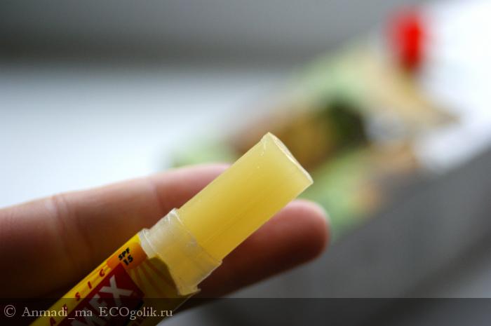 Цвет у стика желтоватый, опять же текстура очень схожа с вазелином. Но к счастью на губах он абсолютно прозрачен.