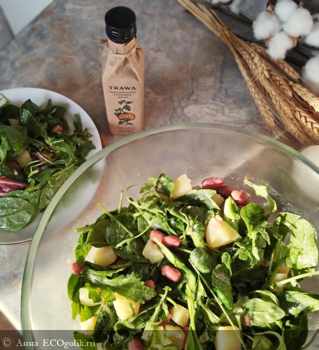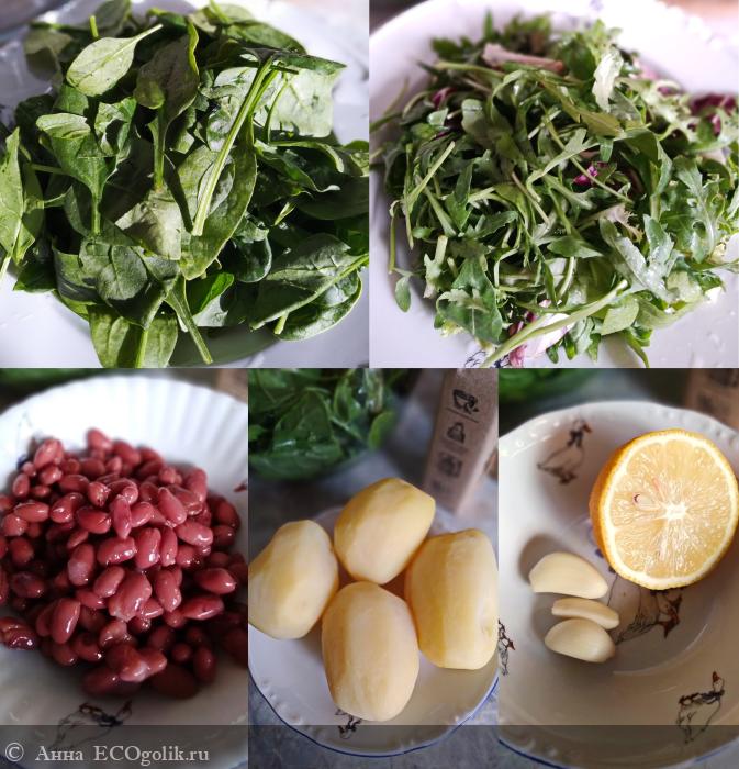 Рецепт совершенно бесхитростный: зелень и картофель нарезать, добавить к ним фасоль, тёртый чеснок, сок лимона, тыквенное масло, винный уксус, поперчить, чуть посолить и перемешать.