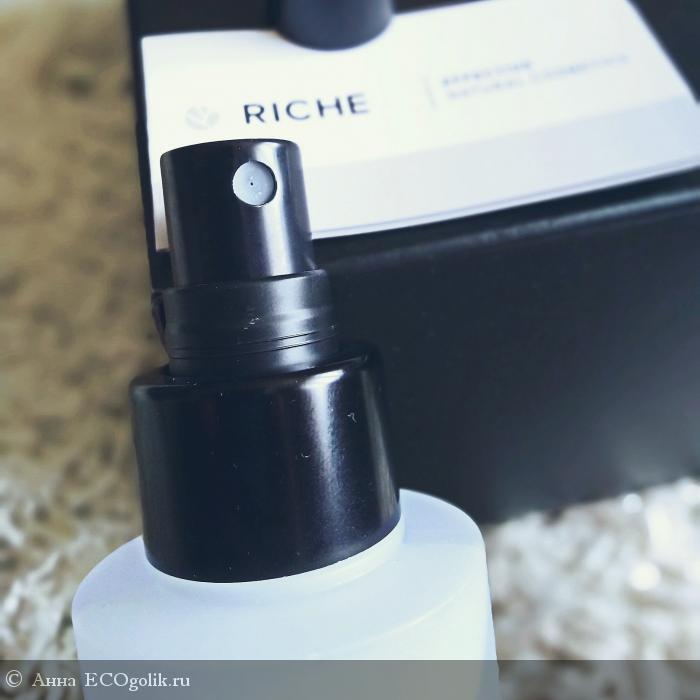 Riche рекомендуют «пропитать тоником ватный диск или нанести на кожу при помощЬЮ распылителя» (такая вот опечатка в буклете, ай-яй