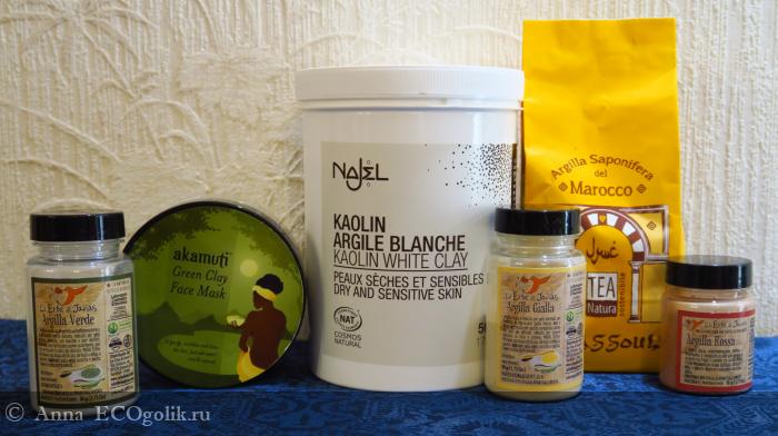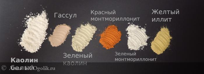 Ниже на фото c лева на право: Зеленый Монтмориллонит, Зеленый Каолин, Белый Каолин, Желтый Иллит, Гассул, Красный Монтмориллонит. У меня была еще голубая глина, но она закончилась(...