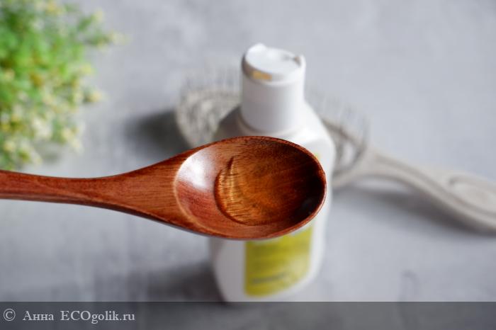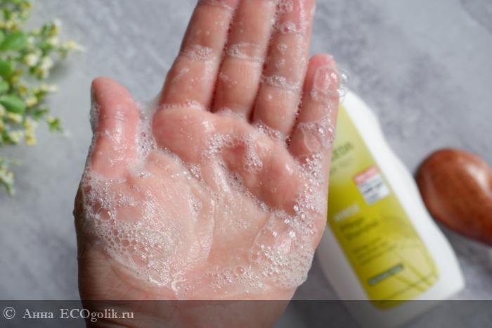 Текстура и консистенция. Это гелевый шампунь, прозрачно-желтого цвета. Он достаточно густой, но текучий. Шампунь прекрасно пенится, даже неожиданно для шампуня без SLS/ALS. На волосах пена образуется очень густая и плотная.