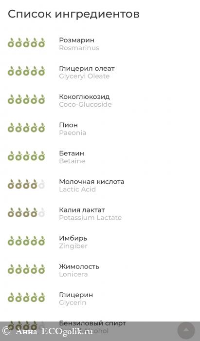 Гидролат розмарина, мягкая «зеленая» моющая основа, глицерил олеат, кокоглюкозид, экстракт корня пиона, натуральный свекольный бетаин, молочная кислота, молочнокислый калий, экстракт корня имбиря, экстракт жимолости японской, глицерин, бензиловый спирт, аллантоин, эфирное масло иланг-иланг, эфирное масло базилика, эфирное масло кипариса, эфирное масло розового дерева, сорбиновая кислота, токоферола ацетат (витамин Е), ксантовая камедь.