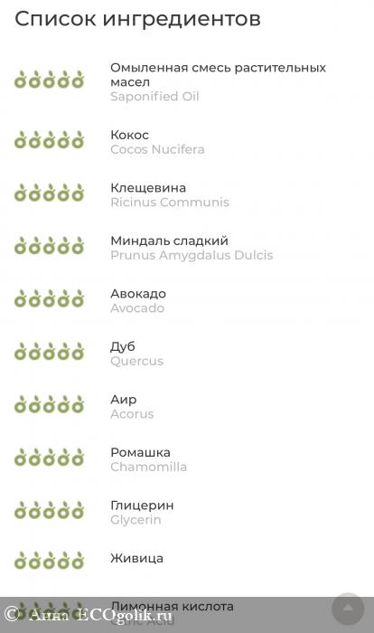 омыленная смесь оливкового, кокосового, касторового масел, масла миндальных косточек и масла авокадо, отвар коры дуба, отвар корневищ аира, отвар ромашки лекарственной, глицерин, натриевая соль кислот еловой живицы, лимонная кислота, протеины кератина, гранулированная целлюлоза, эфирное масло чайного дерева, эфирное масло лавра, эфирное масло шалфея мускатного, янтарная кислота, токоферола ацетат (Витамин Е).