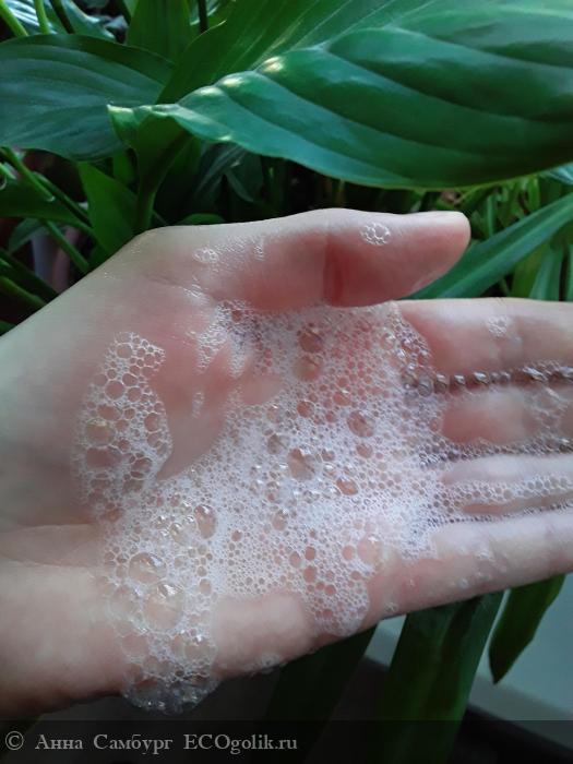 Вначале использования пенится слабо, но потом появляется достаточное количество нежной, мягкой, пушистой, воздушной, кремовой пены с множеством маленьких пузырьков! Смывается с кожи хорошо.