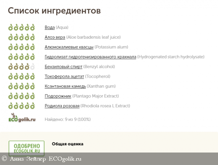 Состав: Aqua (вода родниковая), Aloe barbadensis leaf juice* (алоэ вера гель), Potassium alum (алюмокалиевые квасцы), Hydrogenated starch hydrolysate (сорбитол растительный), Benzyl alcohol, Tocopherol (витамин Е), Xanthan gum (ксантановая камедь), Plantago Major Extract (экстракт подорожника), Rhodiola rosea L. Extract (экстракт родиолы розовой).