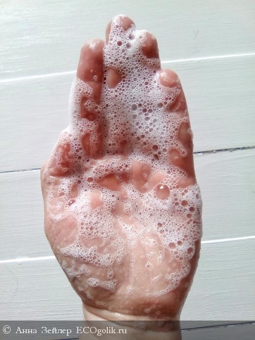 Пенится средство очень хорошо, даже от вот такой небольшой капли (капля растеклась).