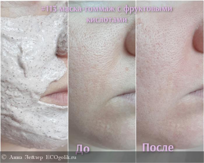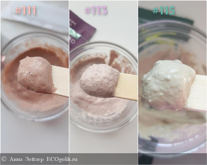 №111 и №113 являясь масками-гоммаж ( т.е. обладающими функцией механического отшелушивания, но не содержащими твёрдых частиц, как в скрабах) позволяют очень деликатно очистить кожу от ороговевших клеток при помощи мягких частиц растений и глины, входящих в состав.
