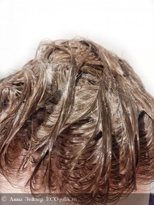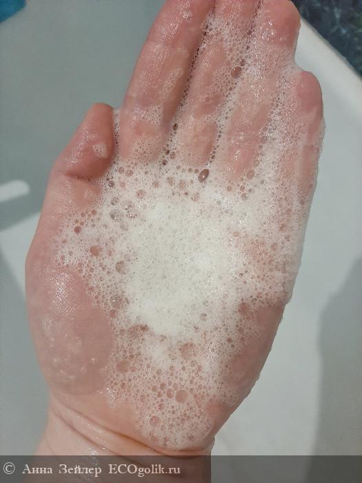 Как и при использовании твёрдого шампуня этот я тоже предварительно вспениваю в руках.