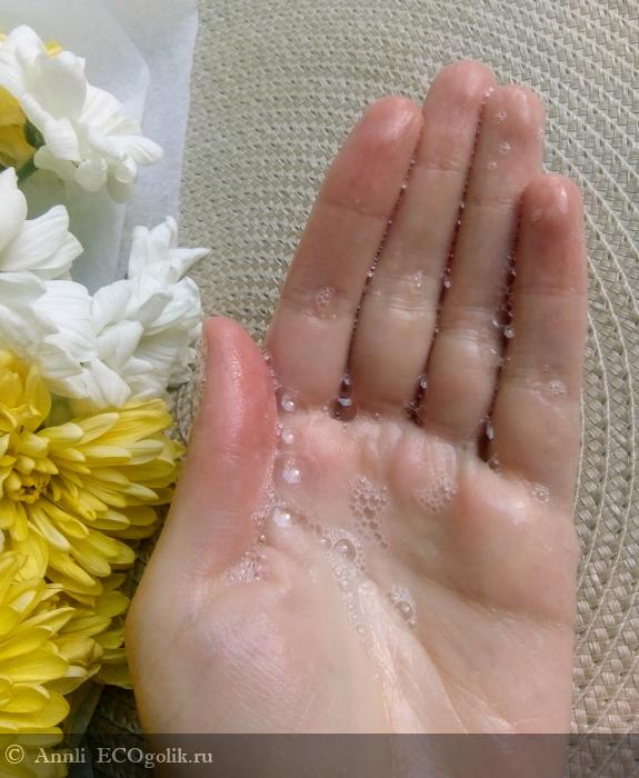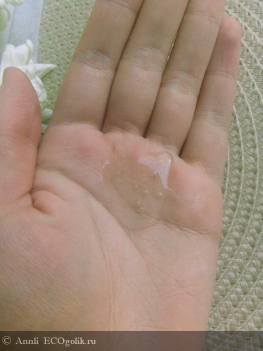 Сам гель прозрачный, не густой. Он легко распределяется по коже и также легко смывается водой.