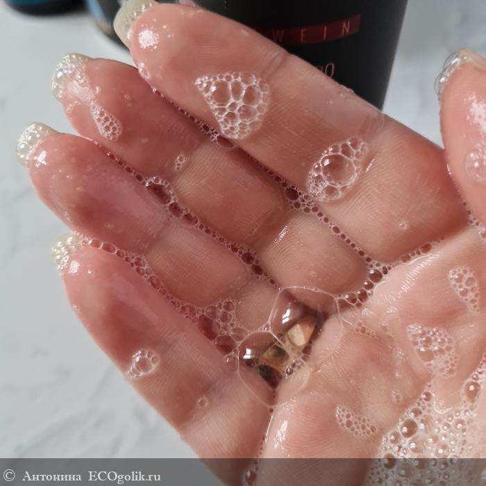 Пенообразование отличное. Достаточно небольшого количества шампуня, чтобы промыть волосы по плечи.