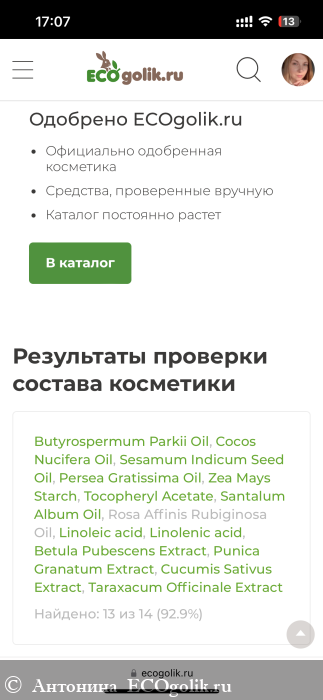 Butyrospermum Parkii (карите) Oil, Cocos Nucifera (Coconut) (кокоса) Oil, Sesamum Indicum Seed (кунжутное) Oil, Persea Gratissima (авокадо) Oil, Zea Mays Starch, Tocopheryl Acetate (витамин Е), Santalum Album (Sandalwood) Oil (эфирное масло сандала), Rosa Affinis Rubiginosa Oil (эфирное масло розы), Linoleic acid and Linolenic acid (витамин F), Betula Pubescens (коры березы) Extract, Punica Granatum (косточки граната) Extract, Cucumis Sativus (семян огурца) Extract, Taraxacum Officinale (корня одуванчика) Extract