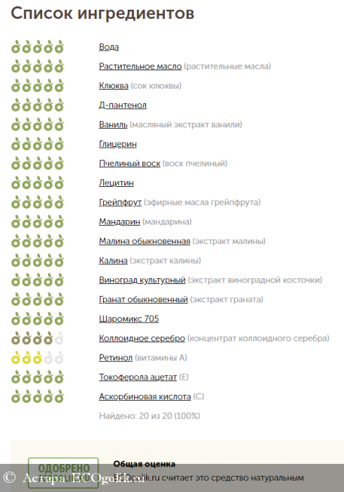 Состав: вода, растительные масла (ши, какао, кокоса, косточки миндаля, авокадо, жожоба, зародышей пшеницы), сок клюквы и винограда, Д-пантенол, масляный экстракт ванили, глицерин, воск пчелиный, лецитин, эфирные масла грейпфрута и мандарина; СО2 экстракты: малины, калины, косточки винограда и граната, шаромикс 705 (комплекс органических кислот), концентрат коллоидного серебра, витамины А, E, С.