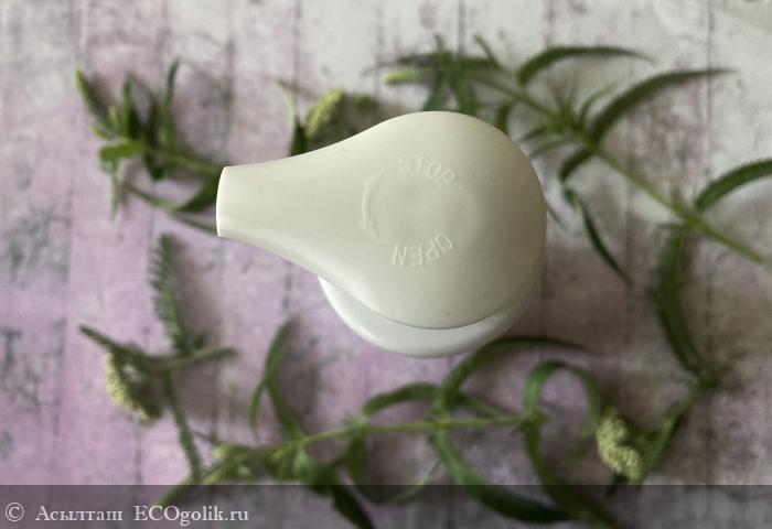 Сверху завинчена крышка с дозатором. Есть удобный носик. Для удобства есть сверху надписи open и stop.